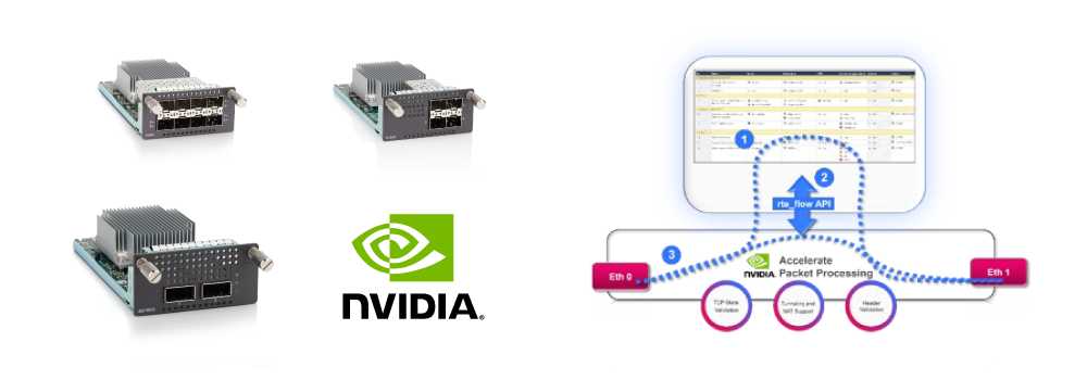 Check Point Quantum Force Security Gatewayの拡張スロットでは8ポート10GSFP・4ポート10/25GSFP28の拡張NICに加え、NVIDIAと共同開発した40/100GQSPFのASIC(SmartNIC)も搭載可能です。